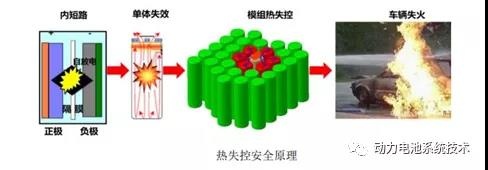 電芯的熱失控是不能完全避免的,電池研究者的主要目標(biāo)是通過電芯材料的改進(jìn)、電池生產(chǎn)工藝的提高來降低電芯發(fā)生熱失控的概率,通過電池組及電池系統(tǒng)的設(shè)計來降低熱失控和熱擴(kuò)散發(fā)生的頻率,同時在熱失控發(fā)生后,研究延長電芯熱失控連鎖反應(yīng)的時間以及降低熱失控發(fā)生后的危險性,為駕駛員及乘客提供足夠長的逃生時間。電芯的熱失控?zé)o論是外因還是內(nèi)因引起,通常的源頭是電池包中局部電芯,單個電芯熱失控發(fā)生后,逐漸產(chǎn)生連鎖反應(yīng),引發(fā)附近電芯接連失控,最終導(dǎo)致安全事故發(fā)生。熱失控的過程如下圖所示,