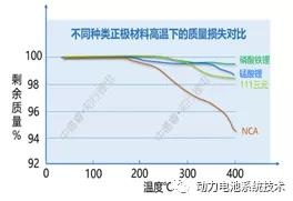 采用相同負(fù)極、電解液、相同結(jié)構(gòu)的磷酸鐵鋰電池、三元電池、錳酸鋰電池相比較,磷酸鐵鋰電池安全性要好得多,所以,正極是影響電芯熱失控安全的主要因素,尤其是在滿充電狀態(tài)下的正極。正極的改善是規(guī)避電芯熱失控的短板。 正極不穩(wěn)定性主要體現(xiàn)在滿充狀態(tài)下分解產(chǎn)氧,不同種類的滿充正極材料在高溫下的產(chǎn)氧差異,如下圖:
